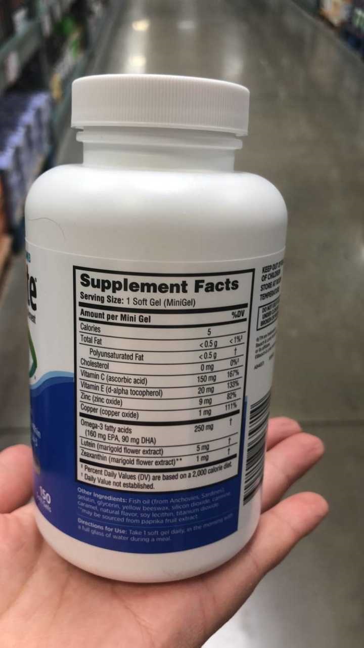 Other Ingredients: Fish oil (from anchovies, sardines), gelatin, glycerin, yellow beeswax, silicon dioxide, carmine, caramel, natural flavor, soy lecithin, titanium dioxide