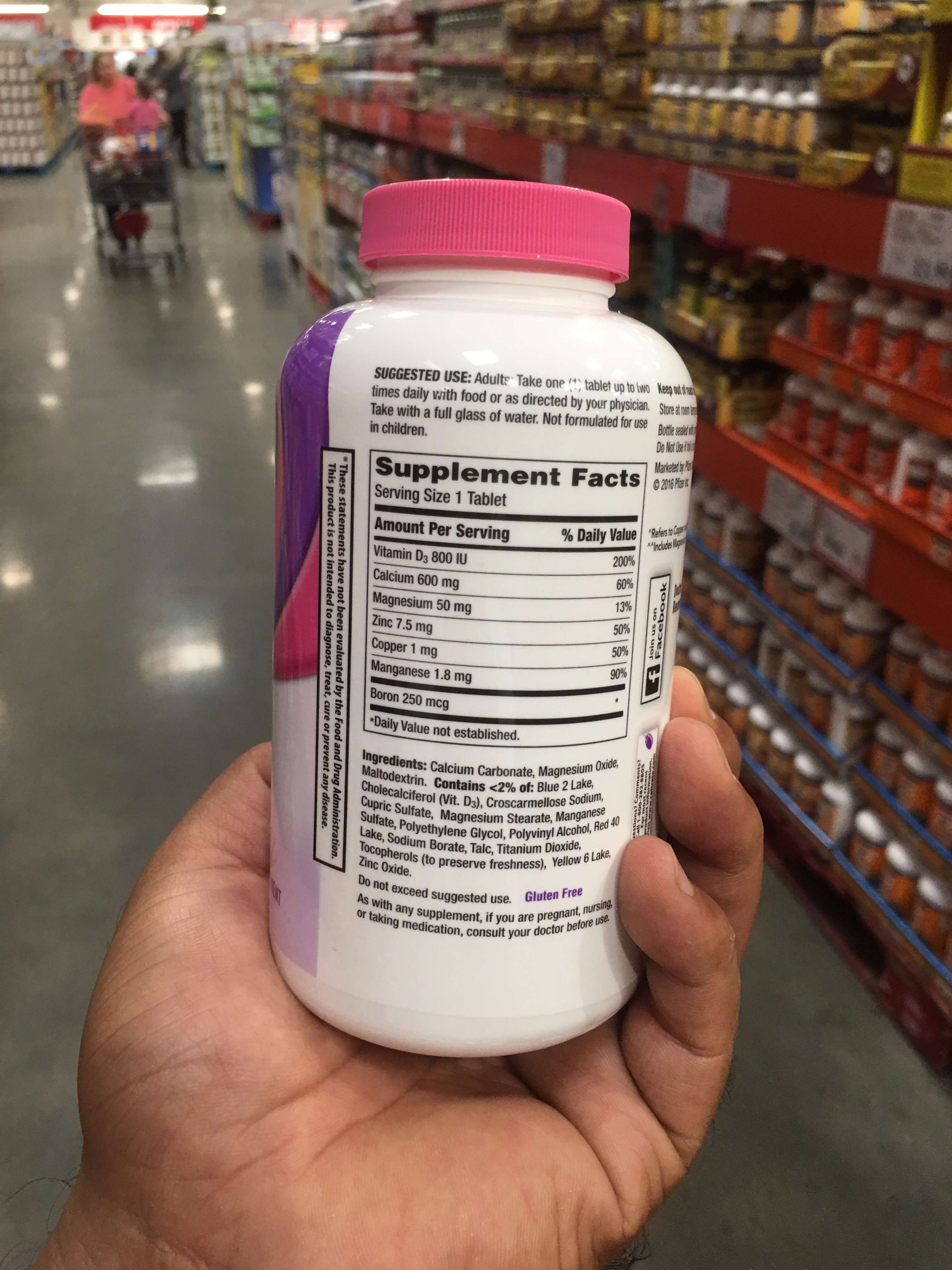 One tablet contains 600 mg of Calcium, 800 IU of Vitamin D3 as well as Magnesium for bone health.? Includes Zinc and other minerals^ to help support collagen production for strong, resilient bones.?