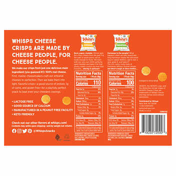 Whisps are made from just one ingredient (you guessed it): 100% "wheel" cheese. First, master cheesemakers craft our artisanal cheese to perfection. Then we bake them into light, flavorful crisps - deliciously low carb, high protein, and gluten free - for a playfully perfect snack to beat even your cheesiest cravings.