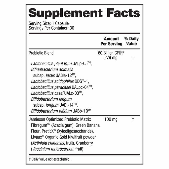 采用Jamieson优化益生元基质配方,积极滋养益生菌,每日一粒的便捷配方 非转基因产品,?不含乳糖、麸质、大豆、人工色素、香料或防腐剂。 含有动物双歧杆菌亚种等7种独特菌株。在乳酸杆菌UABla-12?和嗜酸乳杆菌DDS-1?两个临床研究的益生菌菌株显示其支持整体消化健康,并帮助减少偶发的腹胀,便秘和腹泻。