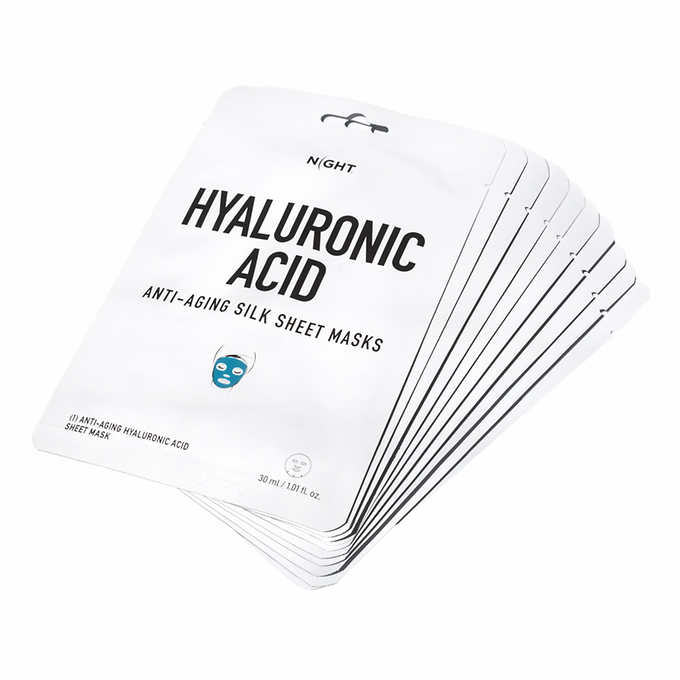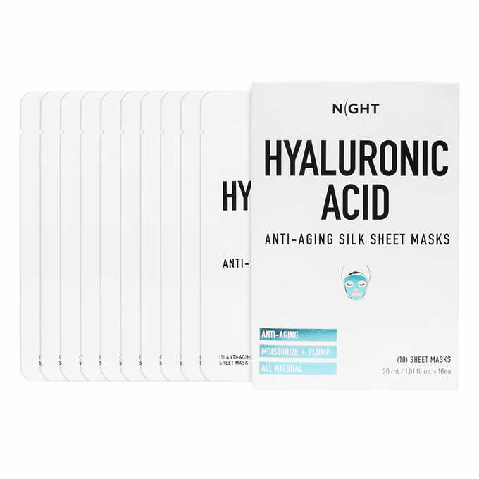 NIGHT玻尿酸抗衰老蚕丝面膜为10片装,能帮助减少细纹和皱纹,滋养肌肤,让您焕发光彩。