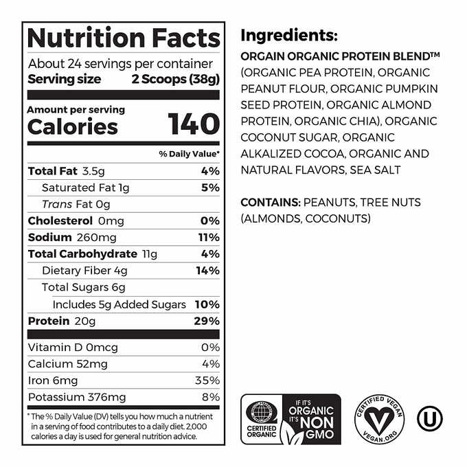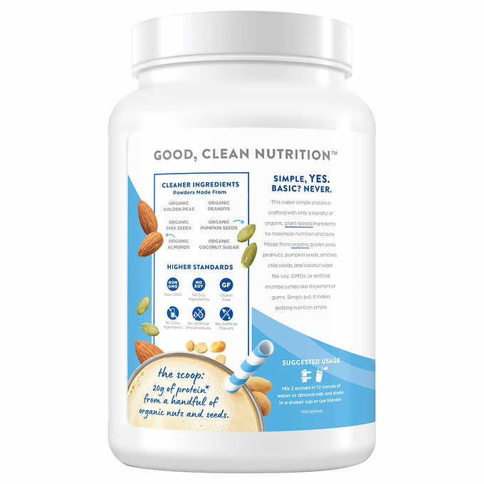 这种超级简单的蛋白质含有20克植物蛋白,仅用少数几种你能念出名字的有机成分制成。只是一些你能念出名字的食材:有机杏仁、花生、奇亚籽、南瓜籽和金豌豆(就是这样!)结合在一起,就是这种超级干净、美味的植物蛋白粉。美国农业部认证有机,认证素食,认证犹太洁食,无谷蛋白。简单地说,这种蛋白质是最干净的。