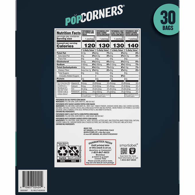 • Variety pack: 8-Sea Salt, 4-Spicy Queso, 10-Kettle Corn, 8-White Cheddar