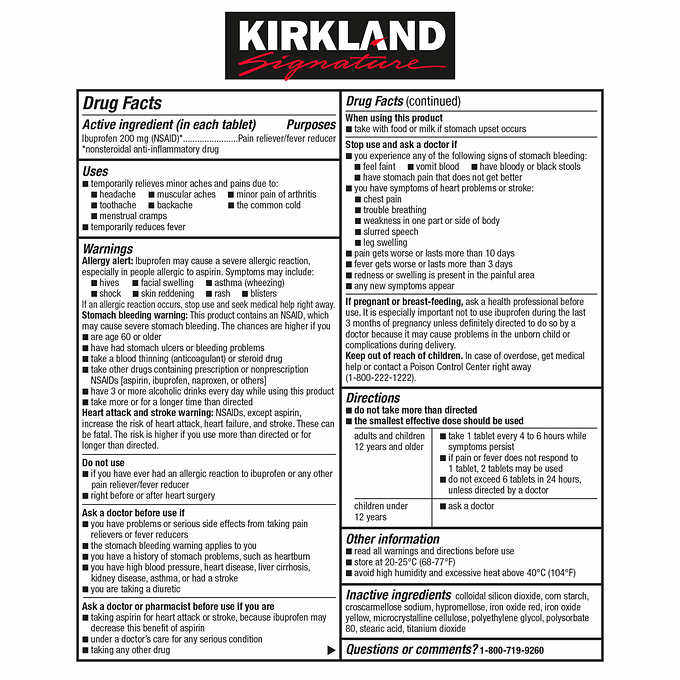 Kirkland柯克兰签名布洛芬片USP, 其有效成分是200毫克的布洛芬,可以作为镇痛/退热剂用于成人和12岁以上的儿童。 柯克兰签名布洛芬片USP, 200mg是非甾体抗炎药(NSAID)。一种暂时缓解轻微疼痛的药物,柯克兰签名?布洛芬片剂USP, 200毫克不含麸质。